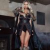 Includes Hooded Cape with Criss-Cross Tie Straps, Low Cut Romper, Mask, Leg Tie, & Trident. You can’t help but slay the crowd in this dramatic and wicked ninja set! Cut their hearts to pieces with an outfit that features a mask, a flowing black cape with straps, a sexy and sleek deep-cut romper, and a long, trident style weapon tied with a seductive leg strap. Make them plead for mercy in this show stopping set. The form-fitting romper, with its plunging V neckline and high cut legs, showcases all your curves in silky and shiny midnight black. It is topped with a long, voluminous black hooded cape that features brown straps which criss-cross and hug your cleavage, making for a daring look they won’t be able to keep their eyes off of. A coordinating brown leg tie can sexily strap on your weapon of choice, a detailed silver trident with brown wrapped handle. The semi-sheer black ninja mask tops off the ensemble for a seductive gaze that will leave them begging for more.
