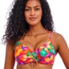 Dive into your next holiday adventure with the Sun Haze high apex bikini top by Freya. Designed to balance style and support, this must-have bikini top combines fashion and functionality to be your new go-to beach favourite. Its underwired structure promises exceptional support, while the non-padded cups and low plunge neckline enhance your natural silhouette for all-day confidence. The elongated apex subtly lifts and highlights your cleavage, complemented by the all-over vibrant tropical print to create an eye-catching poolside look. A customisable fit is offered by fully adjustable shoulder straps with a versatile racerback option, plus a secure plastic clasp closure at the rear. Wear with matching swimwear from the Sun Haze collection for a statement sunbathing ensemble.