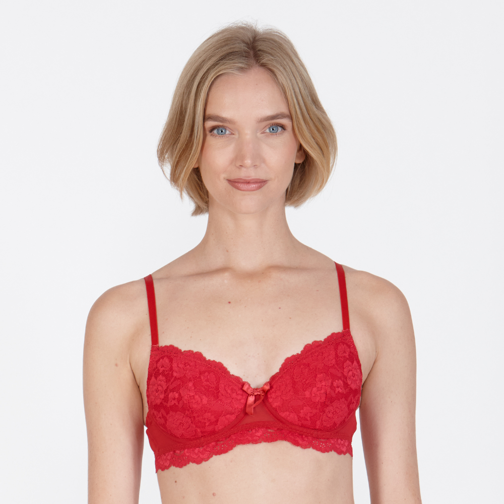 Get ready to feel stunning and supported with the Little Women Cherry You Non-Wired Bra. Featuring removable padding and delicate red lace, this small cup bra will add a touch of beauty to any outfit. Say goodbye to uncomfortable wires and hello to effortless style.. Little Women. Classic LW style. Medium removable padding. Non-wired. Adjustable longer straps as standard. Back fastening with 3 hooks long & 1 hook wide. Lace finish with mesh wings and lace details on the straps. Designed with smaller busts in mind. Matching brief available. Material:. 75% Polyamide, 15% Elastane, 10% Cotton. Available sizes:. 32AAA – 44AAA. 30AA – 44AA. 30A – 44A. Product Code: LWCHYOBRA