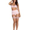Let your confidence shine in this dreamily romantic piece. Eyelash lace coats your body creating an alluring look, coupled with blue ribbon detailing for that added elegance. Intricate strapping detailing on the brief creates a unique and unmissable piece and a seducing style. There is padding in the cups to offer you support, whereas the halter neck fastening allows your bust to be shaped flawlessly. The lace descends your torso coating it in the fine print lace, continuing round the back and finishing in a hook and eye closure for the perfect fit.