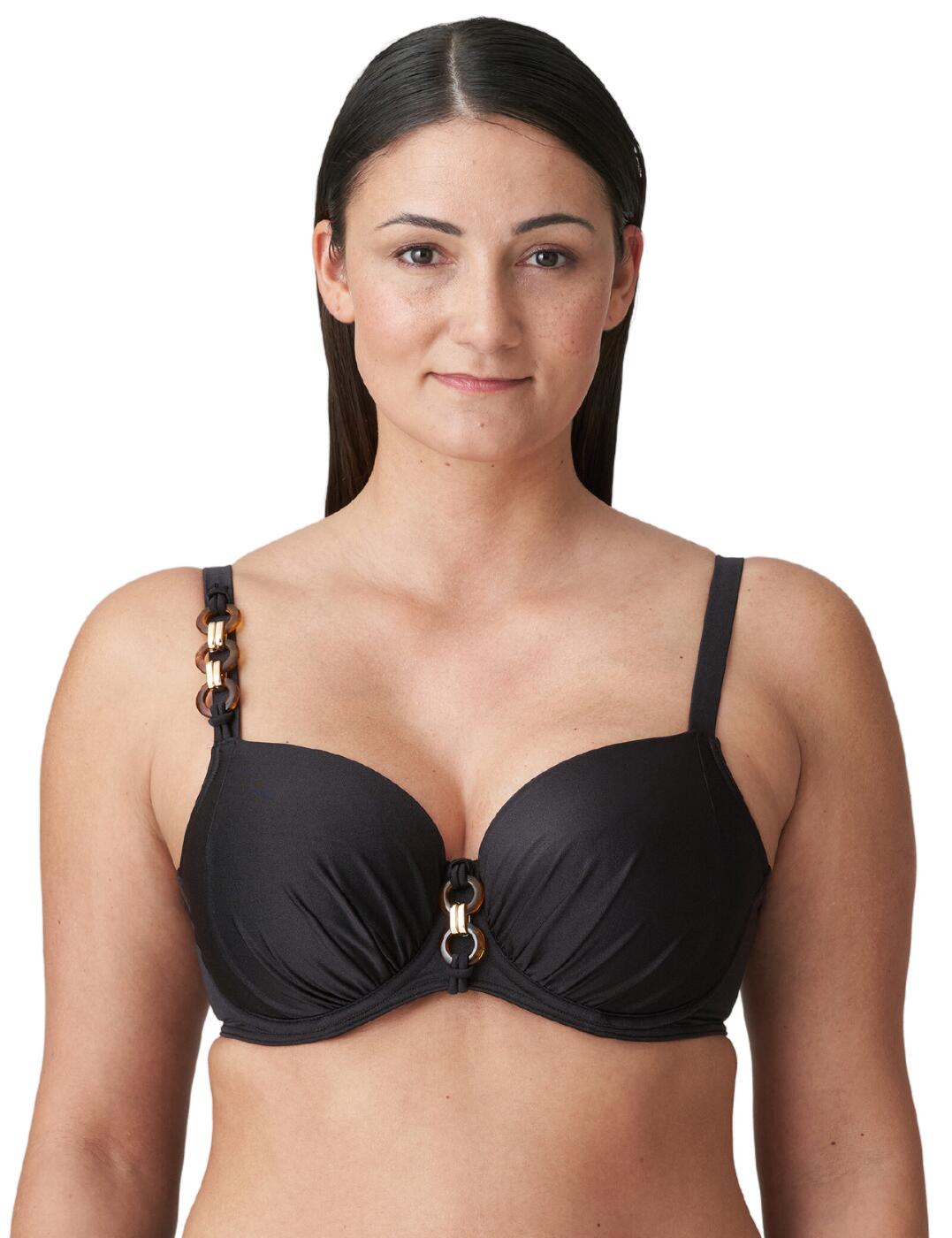 For an effortlessly stylish vibe on your next trip to the beach or pool look no further than this luxurious balcony bikini top from Prima Donna’s Barrani range! A balcony neckline is wonderfully flattering for all body types, and the subtly padded mousse cups combine with the underwiring to enhance and compliment your curves, showing off your cleavage and creating a gorgeous look that celebrates your figure. Decorative tortoiseshell and metallic gold elements on the strap and between the cups add a distinctive flair to this bikini top that will have you standing out from the crowd for all the right reasons! Adjustable straps and a plastic back clasp closure give you the comfort, confidence, and individualised fit you deserve. Pair with coordinating bikini briefs from the Barrani range to complete the look!