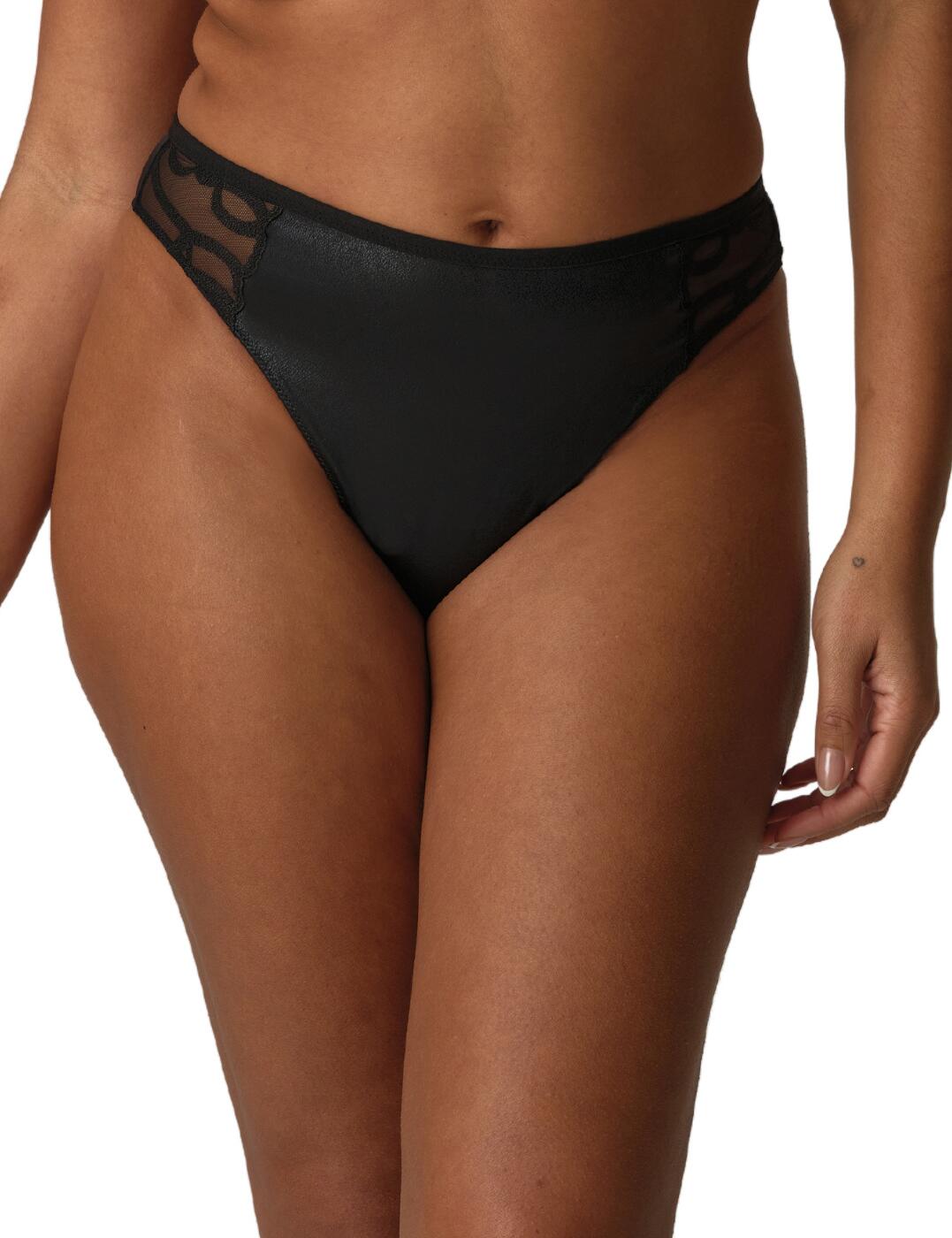 Elevate your lingerie collection with the Prima Donna Vallarta thong. Featuring a faux leather material, embroidered side panels and metallic accents, this brief is sure to upgrade the glamour and style of any outfit. This luxurious thong offers a high waist, minimal rear coverage and a playful cut-out effect, combining comfort with a hint of edginess. Complete the look with the matching coordinates available separately for an indulgent experience.