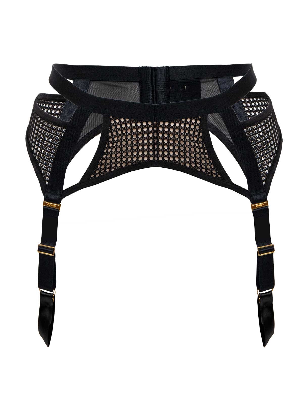 This Pulse Mesh Garter Belt holds its huge personality with wide mesh paneling that forms an attractively sensual net-like appeal. A striking black band hugs the waist before leading into the straps that form the frame of the exquisite piece. Similar to the Pulse Mesh Panties, this garter belt is futuristic in style, breaking boundaries and going where no style has gone before. The sleek straps are dotted by golden clips that slide effortlessly with your favorite pair of VienneMilano stockings. Pulse Mesh at a glance: Luxurious golden metal clips Glamorous mesh detail Soft stretch wide elastic bands Four adjustable suspender straps Stockings not included Product Details Category Garter Belts Materials Polyamide 51%, Polyester 32%, Elastane 17%. Gusset Lining 100% Cotton. Exclusive of trims. Occasions Love, Wedding