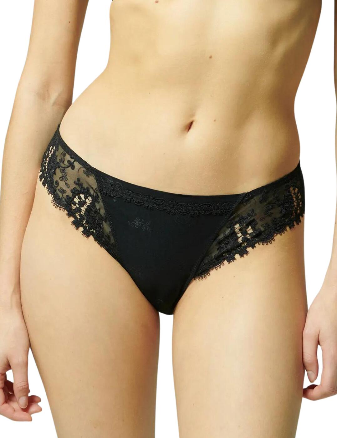 The Wish brief by Simone Perele gives a feminine twist to the classic style. This brief is adorned with delicate embroidery atop sheer fabric, giving it a sensual feel. The back is completely seam…