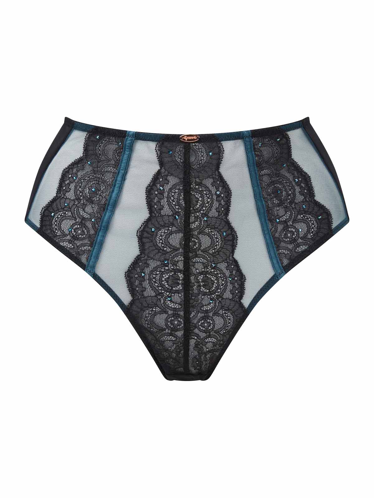 For irresistible, radiant glamor, look no further than VIP Confession. These flattering high-waisted panties embrace and frame your form, invoking pure romance through ornate stretch lace, dazzling diamantes, contrasting teal trims, and alluring sheer panels to the front. Turn around to reveal flirtatious, sheer black mesh, crowned with a tempting v-shaped lace panel that lets your body do the talking. For added drama, complete the look with VIP Confession Garter Belt and VienneMilano stockings. VIP Confession Lace High Waist Panties at a glance: High waisted style Intricate stretch lace and mesh panels Teal diamante highlights Contrasting teal trim Product Details Category Panties Occasions Love, Wedding